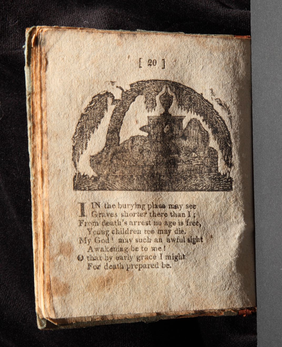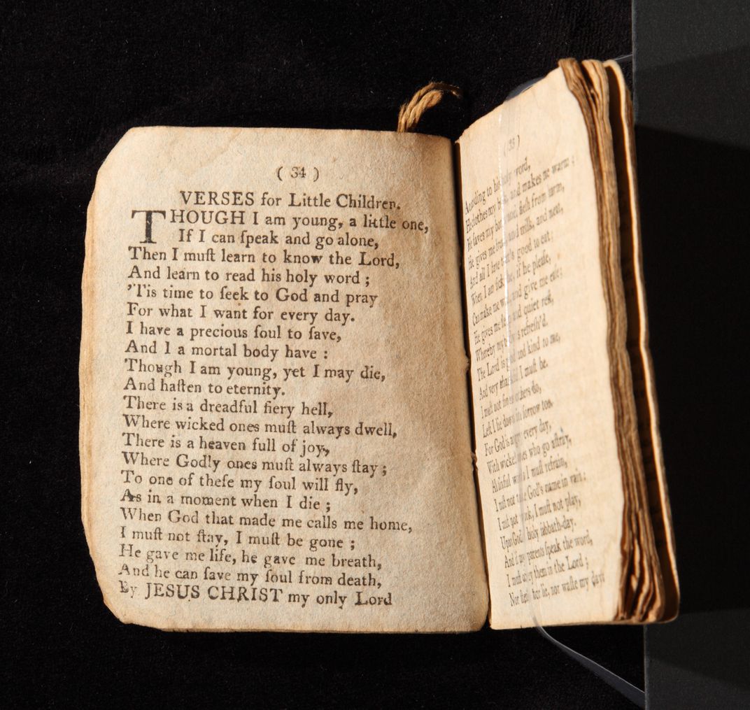 The influence of the Great Awakening—a religious revival in the American colonies in the 1720s, ’30s, and ’40s—brought about several changes to the primer. For example, the couplet for the letter C was amended from “The cat does play / And after slay” to “Christ crucify’d / For sinners dy’d.” The Great Awakening’s influence shifted the primer’s emphasis from God’s wrath to God’s love and contributed to the addition of more prayers and hymns, such as Isaac Watts’s “Cradle Hymn.” As moral education became more secularized, the emphasis on punishment and sin softened. For example, in later versions, consuming fire as a punishment was replaced with the threat of having treats taken away. Literacy as a means to finding eternal salvation was replaced in one 1790 version as a path to financial security, and in an 1819 edition the rhyme for K expressed the value of play—“ ’Tis youth’s delight / To fly their kite.”