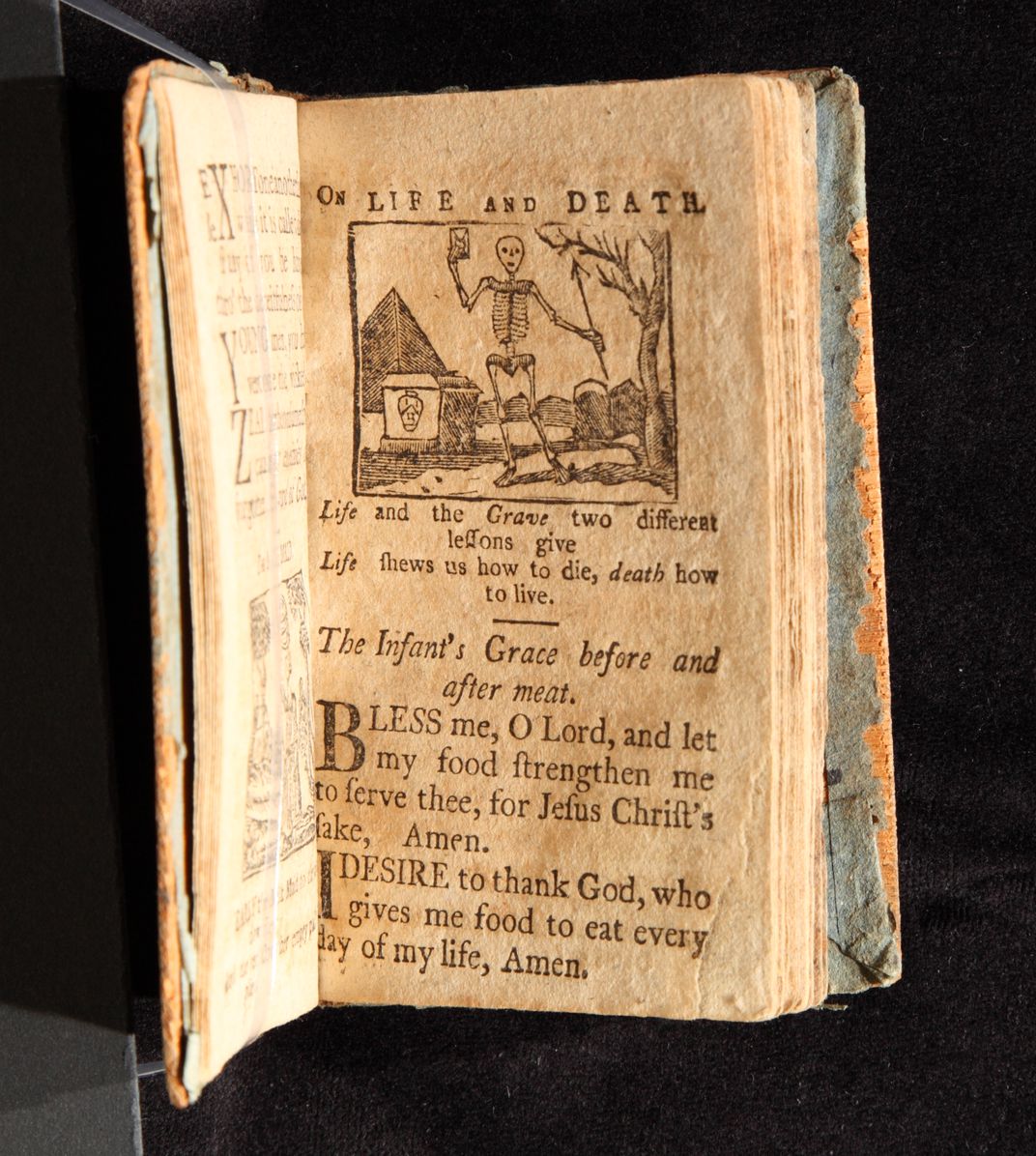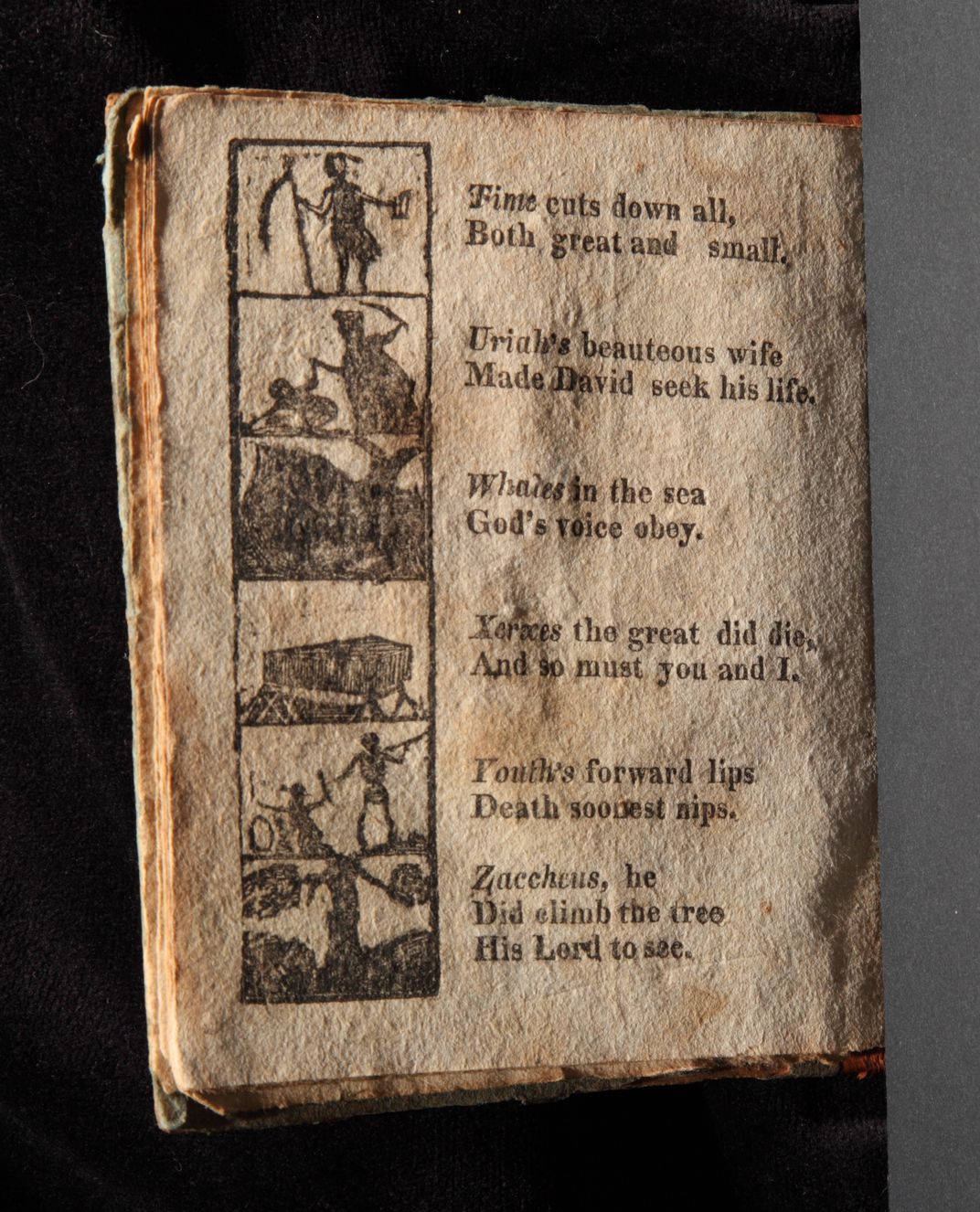 Themes of sin, death, punishment, salvation, and respect for authority were displayed through alphabetic rhymed couplets, poems, prayers, and scriptures. The theme of punishment, for instance, was exhibited in the rhyming couplet for the letter F: “The idle fool / Is whipt at school.” Such themes for a child’s textbook may seem morbid in light of the 18th-century Swiss-born philosopher Jean-Jacques Rousseau’s notions of childhood innocence, but they would not seem so to Puritan families who embraced the doctrine of infant corruption caused by the original sin of Adam.